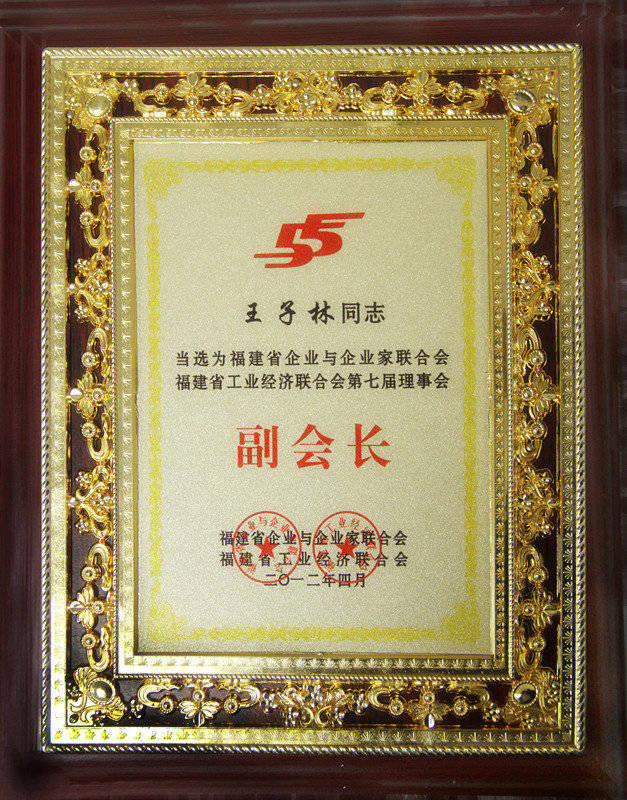 2012年04月 王子林董事长当选为福建省企业与企业家联合会福建省工业经济联合会第七届理事会副会长