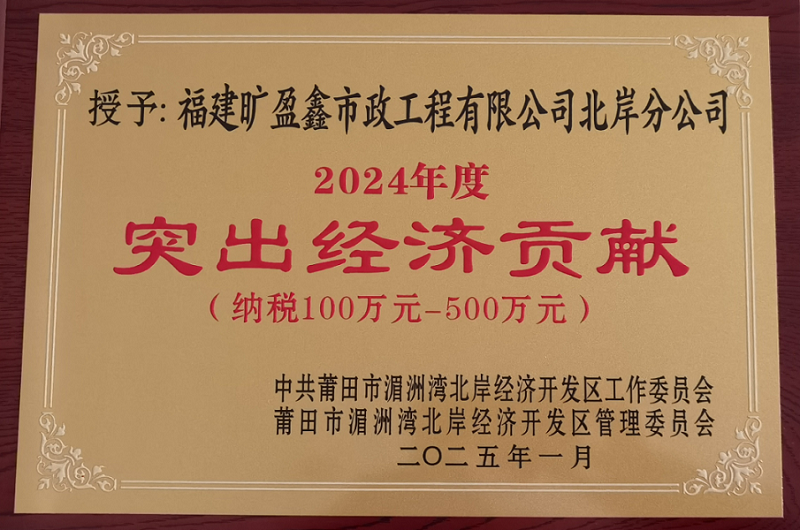 2025年1月 福建旷盈鑫市政工程有限公司北岸分公司被中共莆田市湄洲湾北岸经济开发区工作委员会、莆田市湄洲湾北岸经济开发区管理委员会授予“2024年度突出经济贡献(纳税100万元-500万元)”荣誉