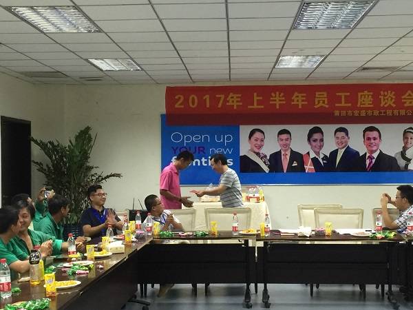 2017年7月14日晚19:30,莆田市宏盛市政工程有限公司组织召开2017年上半年度员工座谈会。本次座谈会旨在了解员工工作、生活情况,听取员工对企业内部管理中的意见和建议,进一步加强与员工的沟通和交流,帮助公司改善管理、提高效率。