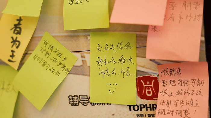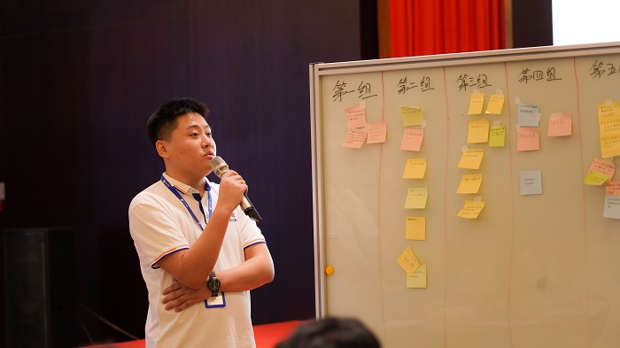 在探究学习的过程中,墙上不断累积出愈来愈多的学员培训感悟分享。随着培训的深入,学员们不断精细化的了解销售概念即“销售就是服务”,同时讲师利用一些职场工具教会学员提前预判客户价位、中国式客情维护、个人目标分解等内容。