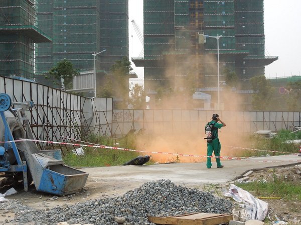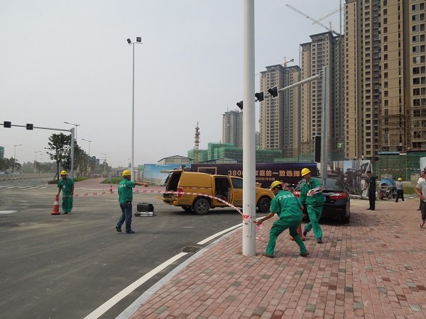 演练开始。首先,2652111抢险电话接到莆田市万科城溪园小区(尚济路)北侧建工地的施工单位的报警。该单位因进行小区绿化平整工程建设的需要,动用挖掘机施工,却因对管线位置的不熟悉而盲目操作,致使我司敷设在工地内的De110预留中压管被铲断,造成燃气大量泄露,现场白雾弥漫,并发出较为强烈的气流声。公司管网部门接到报警后,立即将事故初步情况上报有关领导,并启动公司紧急预案。紧接着,调控中心立即对事故抢险人员和突发事故应急处理各小组人员进行调度并协调宏盛市政工程公司做好抢修准备。我司调控中心亦配合客服部向用户发布紧急停气通知。接到通知后,各抢险和事故处理人员立即赶往事故现场。到达现场后,工作人员马上疏散场外围观群众,拉起警戒线,对有效区域隔离警戒;抢险人员佩戴安全设备进入事故现场,查找泄漏点,并及时对事故点进行抢修。各抢险和事故处理小组各司其职,相互配合,经过多方抢修,事故最终得到解决。最后,总指挥指示客服部门向各小区用户及物业管理发送短信通知恢复供气,并通知人员撤离和解除紧急警报讯号。