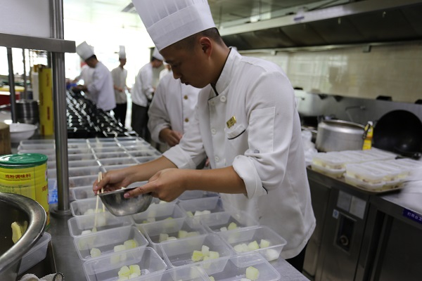 图为酒店厨师们正认真搭配爱心便当