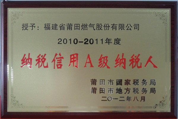 莆田燃气获“2010-2011年度纳税信用A级纳税人”称号