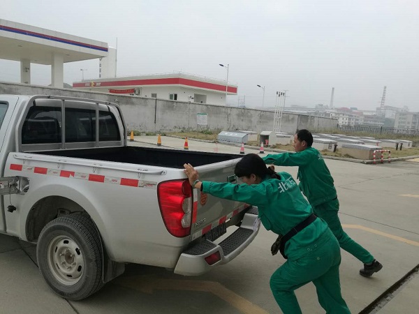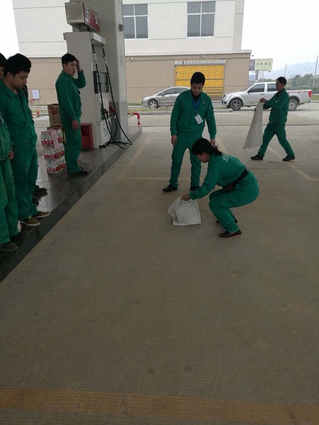 本次演练分为四部分,分别为:安全知识灌输并传达安监局文件精神、岗位技能培训、车辆着火应急演练、消防器材使用。主要内容为,第一,结合县安监局要求进行安全知识灌输,特别对常见的安全问题及汽油打桶等新的安全要求进行灌输;第二,在加油岛开展岗位操作技能演练,主要对车辆引导手势、客户加油前中后的口号、消防石棉毯的使用等方面技能进行实际操作;第三,开展车辆着火应急演练,其中演练分为三组,每组4个人,演练假设用户车辆冒烟,随后加油员收加油枪鸣笛呼叫,场站人员听到呼叫第一时间合力将车辆推出加油站安全距离,再进行轮流灭火步骤;第四,在商业楼最左侧进行消防器材使用实操,首先站长对灭火器及石棉毯的使用进行详细讲解,再由每个加油员轮番进行实操演练。