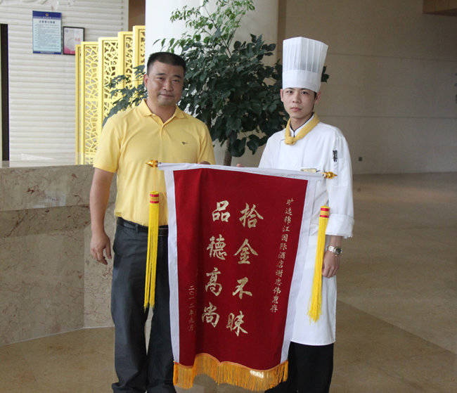 9月8日下午,来自厦门的陈德明将印有“拾金不昧 品德高尚”的锦旗交到火狐网页版登录入口锦江国际酒店西厨师长谢志伟的手中,以表示对谢志伟拾金不昧的良好行为以及酒店员工所表现出来的职业素养的感谢。
