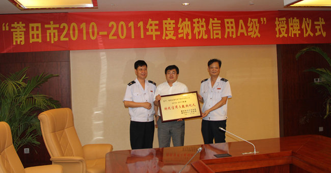 根据国家税务总局《纳税信用等级评定管理试行办法》的文件精神,经过莆田市国家税务局、莆田市地税局联合评选、市评定办公室审核、公示等一系列程序,莆田燃气股份有限公司在纳税信用等级评定中表现突出,被授予“2010-2011年度纳税信用等级A级纳税人”荣誉称号。
