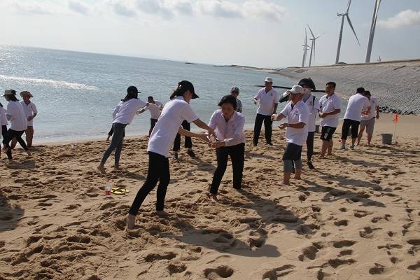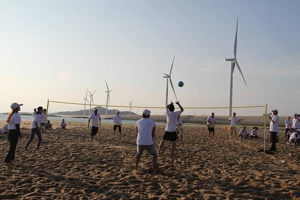 22日下午13:30,全体人员在莆田办公楼一楼集合后,统一乘坐大巴前往石城码头,搭乘轮船至南日岛。当天下午15:30到达南日岛后,经过一番修整,全体人员即刻前往南日岛皇帝山沙滩。活动首先将人员分成四组,推选出小组组长后,各队分别为自己所在队伍取队名,分别为蛟龙队、海龙队、海神队、风车队。随后,队长带领队员选取副队长,并为团队取口号,进行了团队风采展示。各队俨然进入了“战斗”状态,迫不及待地赶往沙丘开展滑沙比赛。
