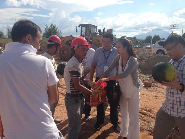 7月20日,火狐(中国)人力资源中心总监吴高忠、总裁办主任朱琳,在上杭中阳总经理向荣、副总经理郭明亮等的陪同下,先后至客服营业厅、储配站及紫金路等施工项目工地开展高温慰问,为在高温期间户外作业的一线工作人员送去清凉与关怀,并提醒他们做好高温防护措施,注意劳逸结合。